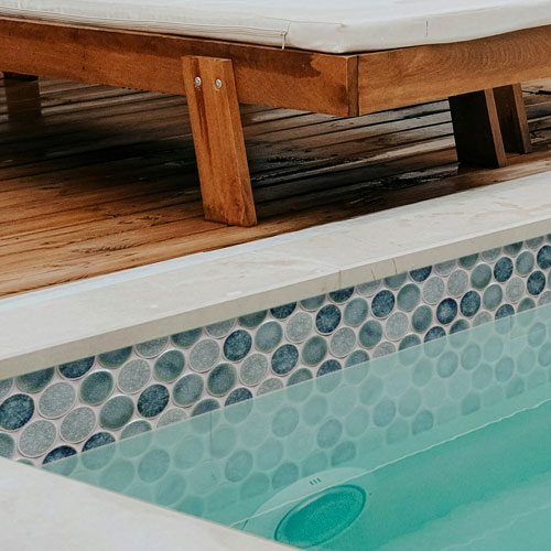 Riad mosaic shown in Ocean, Peacock and Rain quartz glazes.